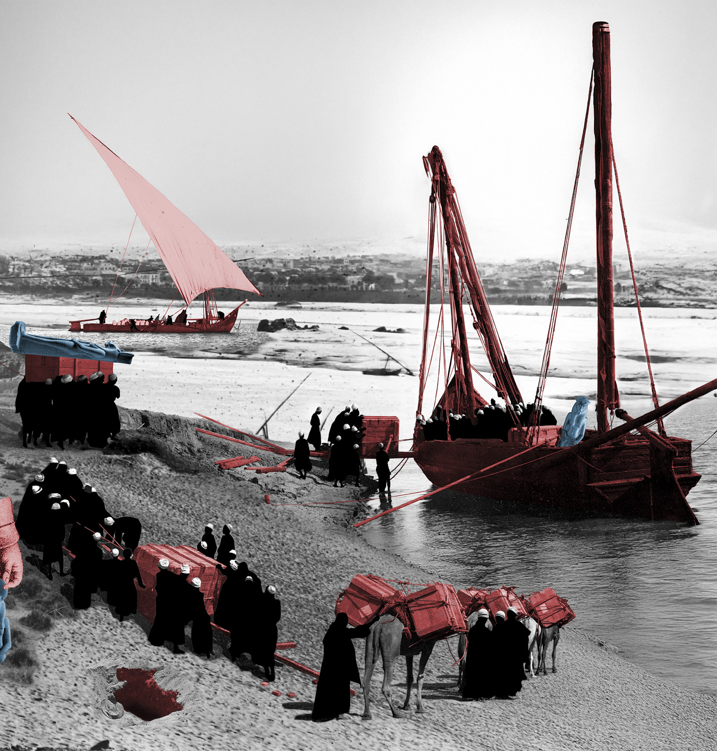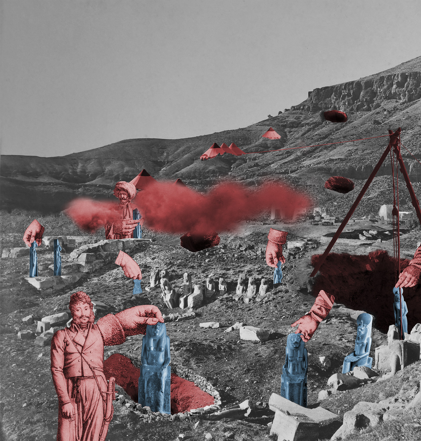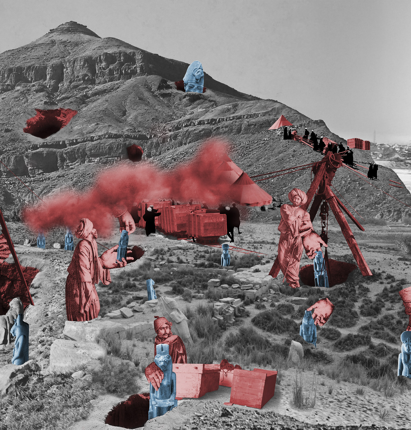 The first Sekhmet statue to reach Italy in 1759 was removed from the Temple of Mut by Italian botanist Vitaliano Donati, commissioned by King Charles Emmanuel III. Sixty years later, twenty more were excavated from the same temple by French sculptor Jean Jacques Rifaud for Drovetti. This collage reimagines the violent act of wounding the land to extract these twenty-one statues as the start of countless excavations, culminating in the discovery of Amenhotep III’s tomb in Thebes' mountains. It combines an 1819 painting of Drovetti and his agents, two archival photographs from the Brooklyn Museum showing the temple dotted with partially excavated statues, and 20th-century photographs from the Museo Egizio archives documenting the removal of antiquities from their funerary contexts.