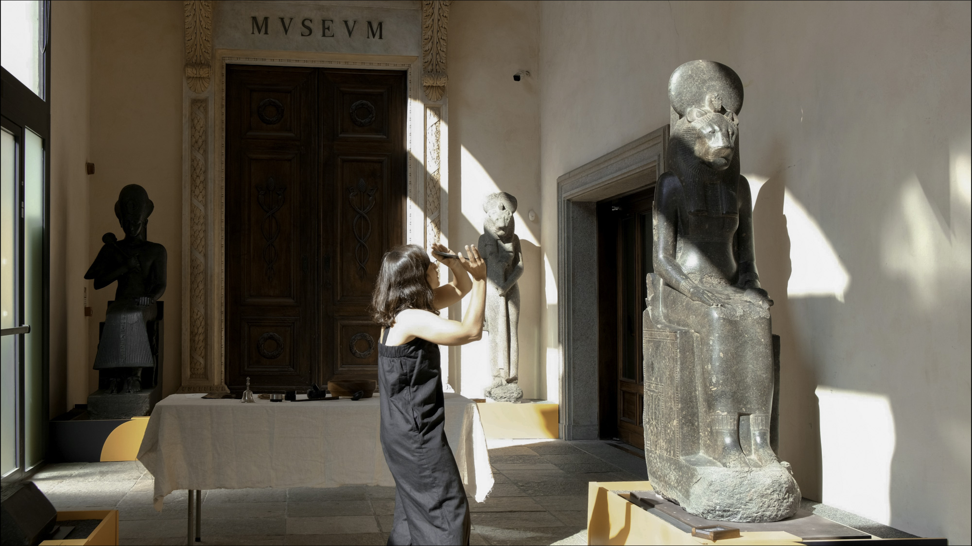 This two-channel video piece is part of an mixed-media installation commissioned by the Museo Egizio in Turin titled, The Sun Weeps for the Land And Calls from the Garden of Stones. The installation addresses how hundreds of statues of the goddess Sekhmet carved during the reign of Amenhotep III were unearthed and uprooted from Egypt in the early 19th century. Their diaspora was facilitated by a colonial infrastructure enabling consuls to act as both diplomats and antiquities dealers. For the Italian-born French consul Bernardino Drovetti, this dual role proved lucrative when he sold his amassed collection, including twenty Sekhmet statues, to King Carlo Felice in 1824, forming the core of the Museo Egizio. In this installation of three artworks, we are reminded that these sacred statues, which once safeguarded the ancient king, now linger anguished in museums after failing to fulfill their spiritual purpose.