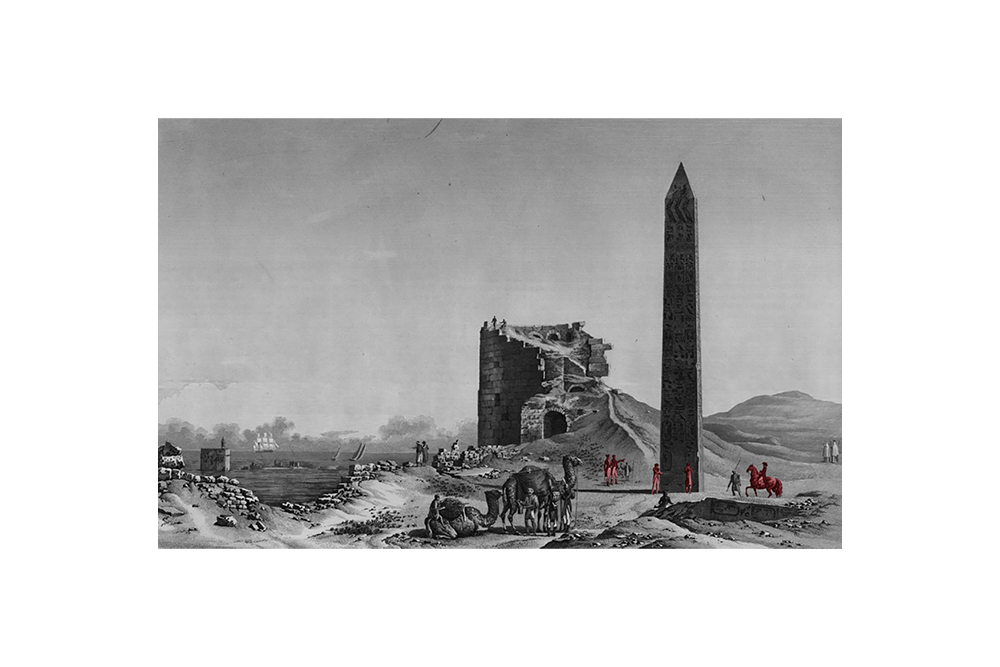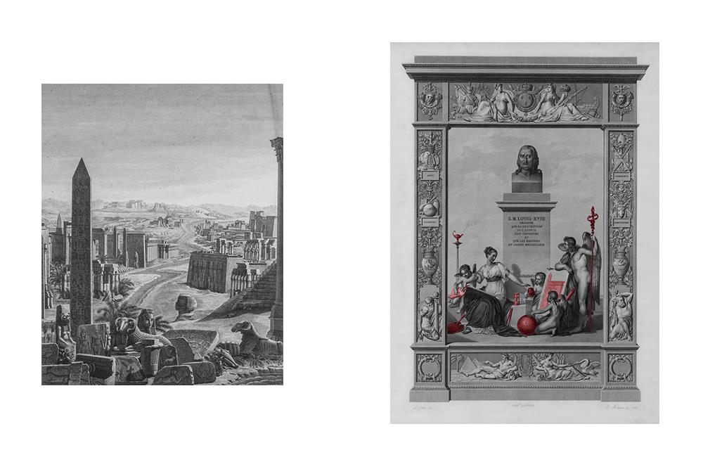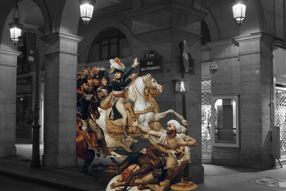 criticising Napoleon Bonaparte’s 1798 military campaign in Egypt. The guide contains a series of photographic collages combining photographs of Parisian streets named after famous battles from that conquest with 19th-century paintings depicting them. By interweaving these collages with fragments of Napoleon’s speeches to his soldiers and the Egyptian people, I criticise the historical events that these streets commemorate. The guide also includes a selection of digitally retouched archival illustrations made by the savants who accompanied Napoleon. With these portrayals of Egypt, which were presented as the outcome of an objective scientific expedition, I seek to accentuate the significance of this campaign as a catalyst for a particular, ever-lasting western interest in Egypt.